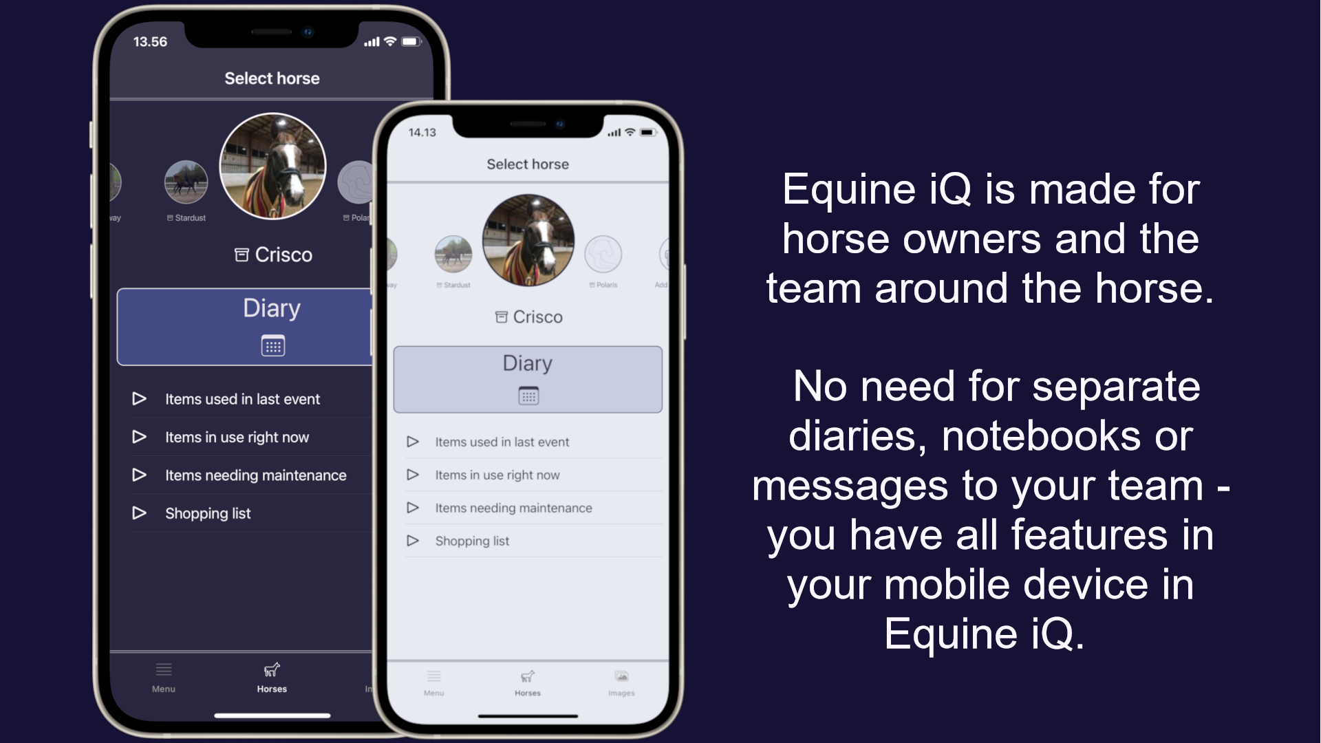 Manage every aspect of your horse’s life with ease. Our Equine iQ app offers tools for health tracking, training logs, and reminders so you never miss a beat. From competition prep to nutrition management, get the insights you need to care for your equine partner effectively.