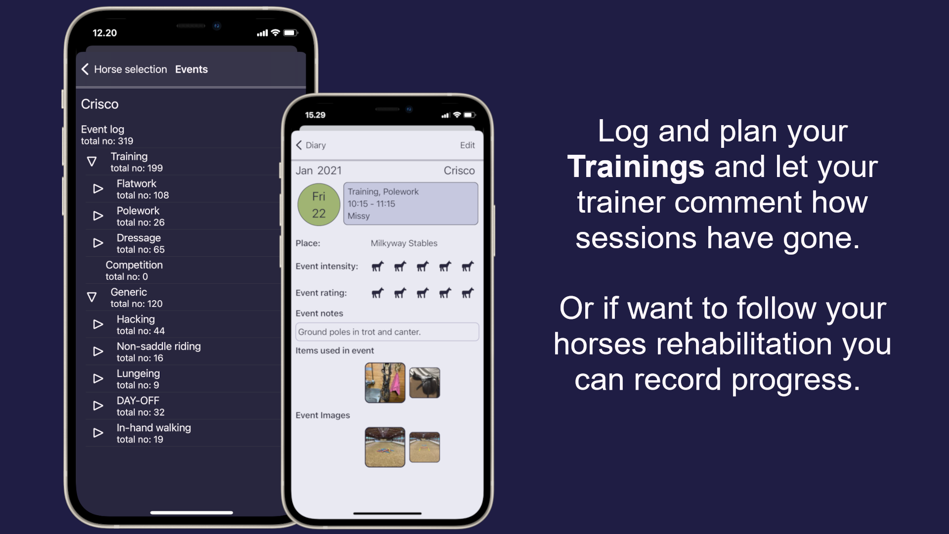 Log every training session with ease, rate intensity, and monitor performance trends over time to optimize your horse’s training regimen.