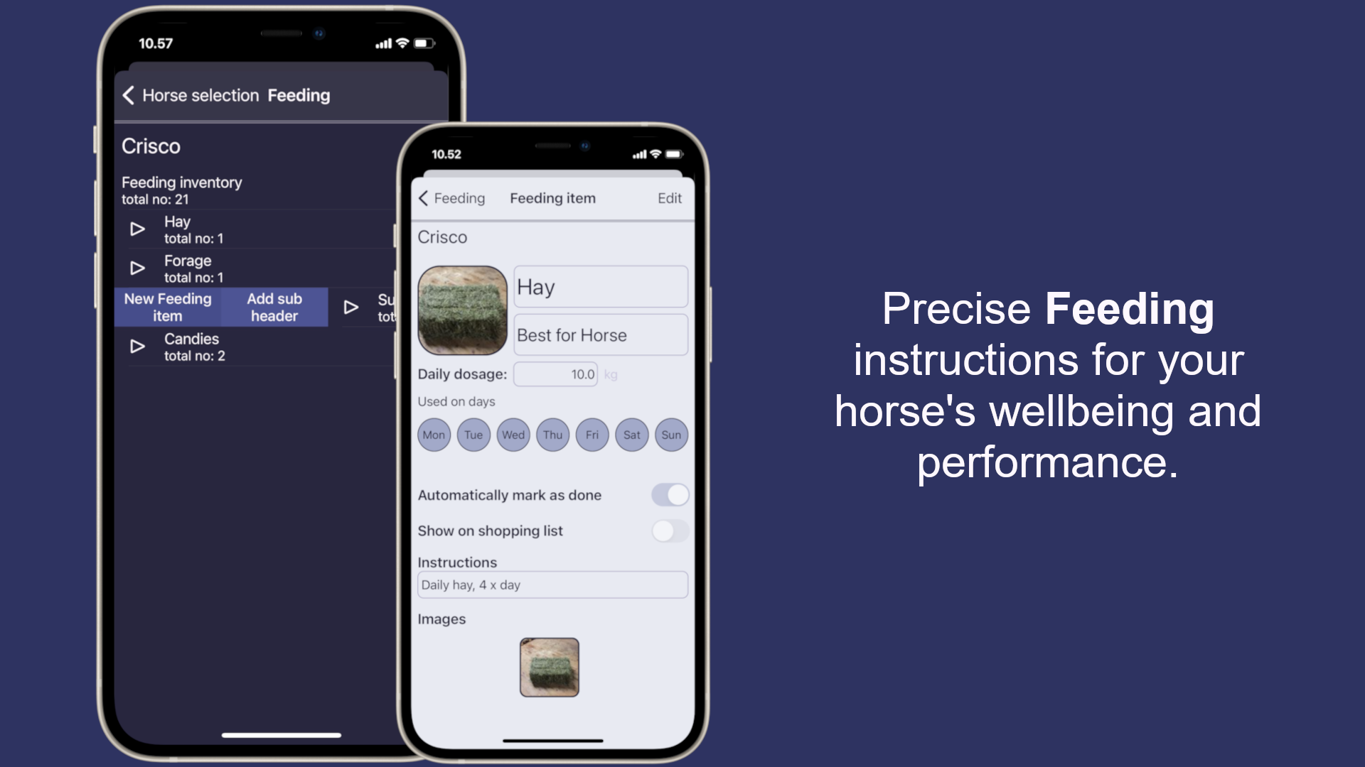Access your horse’s daily feeding schedule quickly, ensuring nutritional consistency, log and share feeding schedules, supplement details, and portion sizes to your team.