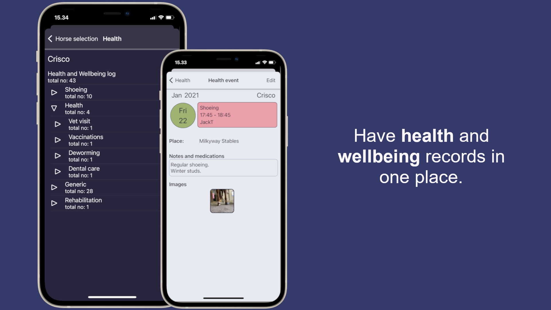 Keep an eye on your horse’s health with tools designed for tracking vital stats, medical history, and health changes over time.