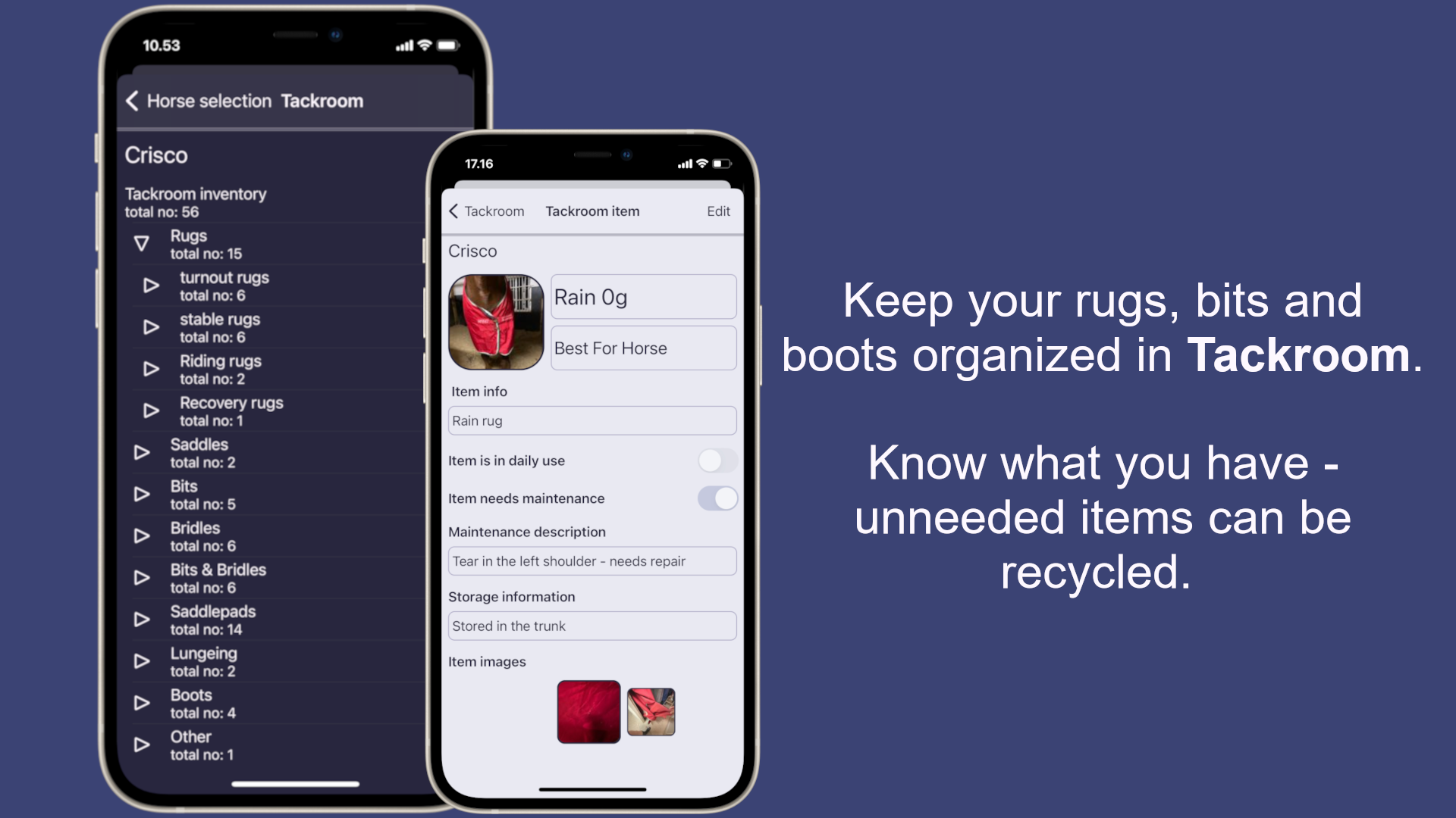 Instantly identify which tack items are actively used, require maintenance, or need replacement, so your equipment is always training-ready.